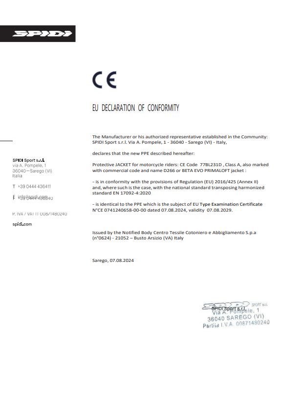 SPIDI Beta Evo Primaloft®: Der Motorradmantel für den urbanen Pendler kombiniert extreme Wärmedämmung und unvergleichlichen Komfort. Das 3-lagig laminierte Obermaterial mit wasserdichter und atmungsaktiver H2Out®-Membrane hat den Vorteil, dass es sehr leicht, trotzdem widerstandsfähig ist, und die Jacke über Freizeitkleidung getragen werden kann. Die herausnehmbare Primaloft® Thermoinnenjacke erweitert den Temperaturbereich erheblich und kann als eigenständiges Kleidungsstück getragen werden. Beta Evo Primaloft® ist CE prEN 17092-2: 2017 Klasse A zertifiziert, auch dank der herausnehmbaren Warrior Light Protektoren auf Schultern und Ellenbogen. Level 1 und Level 2 Warrior Rückenprotektoren sind als Optionen separat erhältlich.