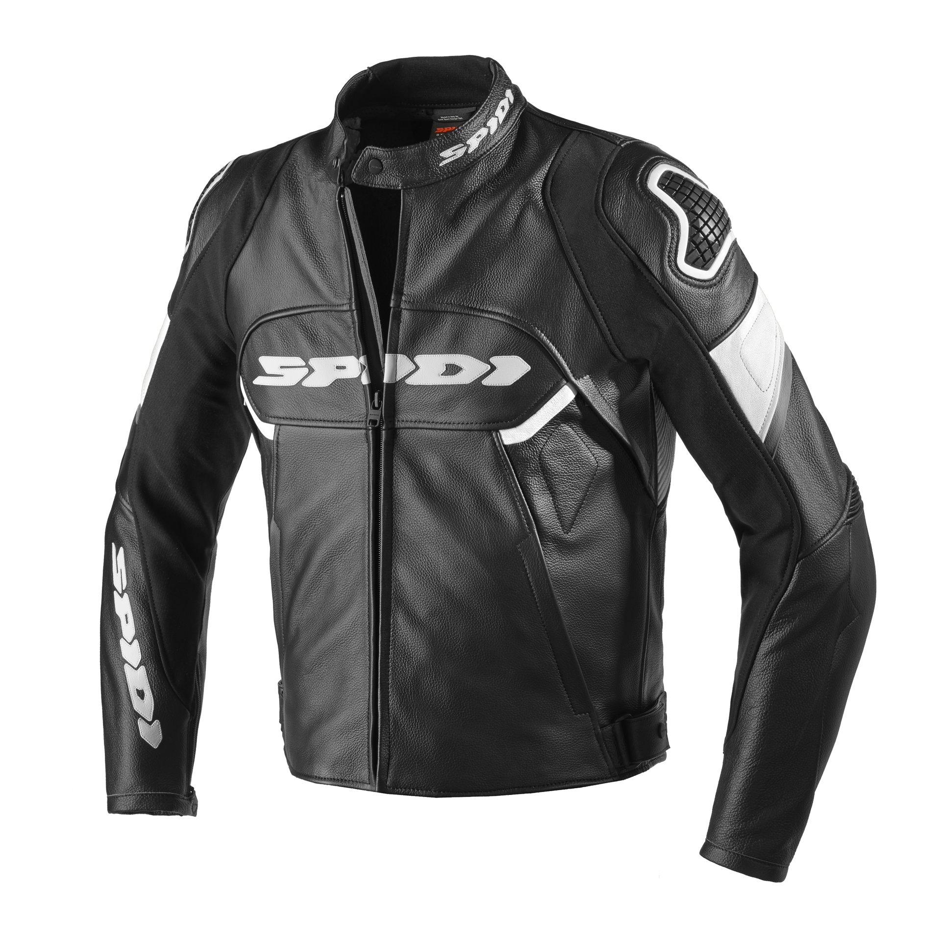Technische Motorrad-Lederjacke SPIDI mit abnehmbaren EG-zertifizierten Protektoren an Schultern und Ellenbögen.