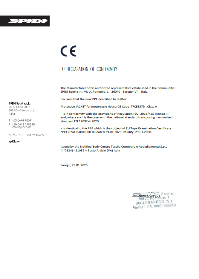Die Jacke ist gemäß CE EN 17092-4:2020 Klasse A zertifiziert und mit herausnehmbaren Warrior Light Level 2 Protektoren an Schultern und Ellenbogen ausgestattet. Zusätzlich sind Rückenprotektoren der Level 1 und Level 2 als Optionen erhältlich.