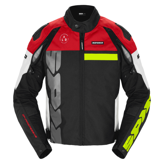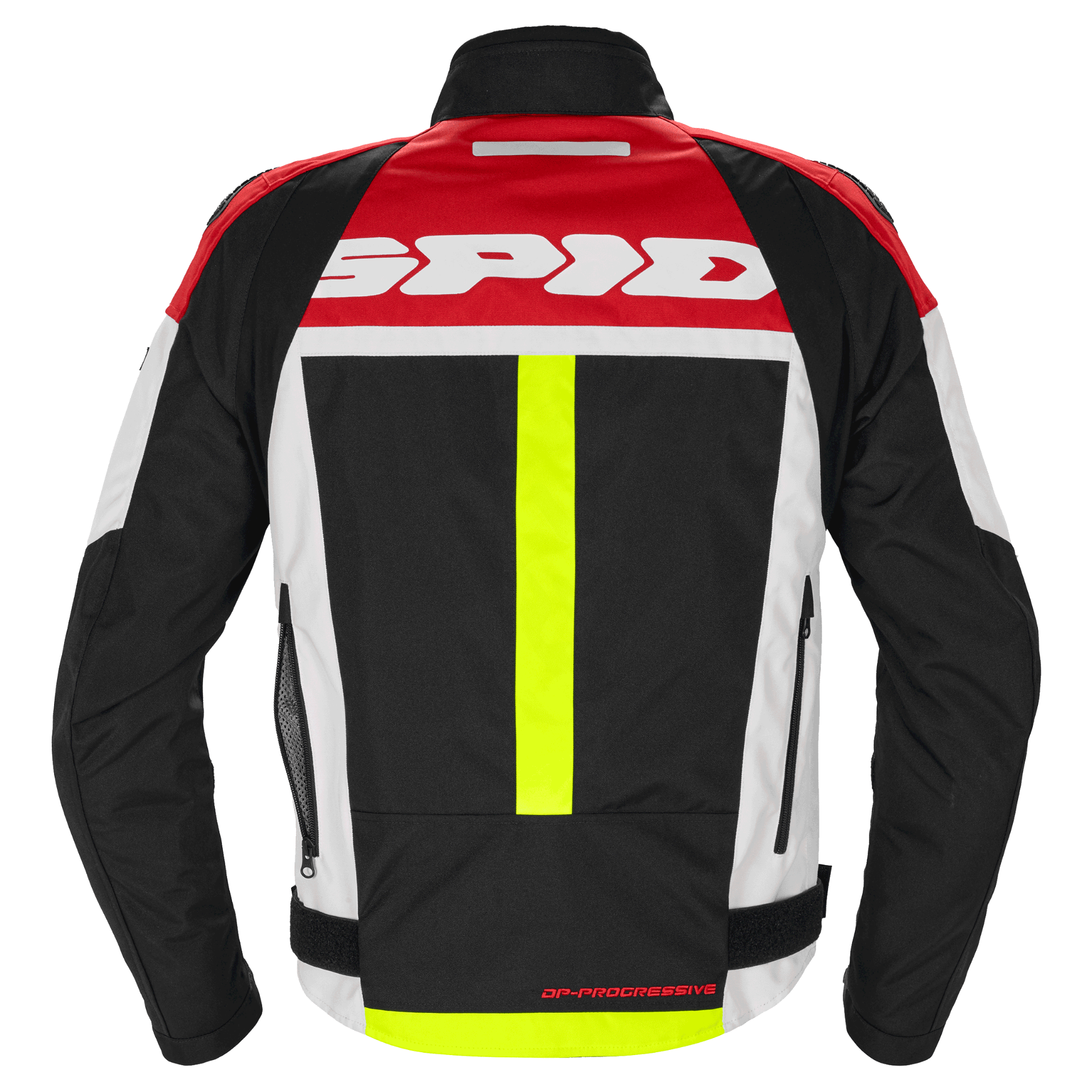Der Aufbau der Progressive Tex ist ein hochabriebfestes, hochfestes Polyester mit reflektierenden Zonen für bessere Sichtbarkeit auch bei Nachtfahrten. Die Vorderseite jeder Schulter hat eine Reißverschlussöffnung für einen einstellbaren Luftstrom, und es gibt verstellbare Taillenlaschen auf beiden Seiten und den Armen, um eine nahezu maßgeschneiderte Passform zu erreichen. Auf der Rückseite befinden sich Belüftungsöffnungen, ebenfalls mit Reißverschluss zu schließen.