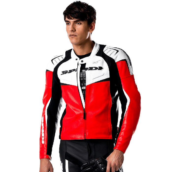 Technische Motorrad-Lederjacke SPIDI mit abnehmbaren EG-zertifizierten Protektoren an Schultern und Ellenbögen.