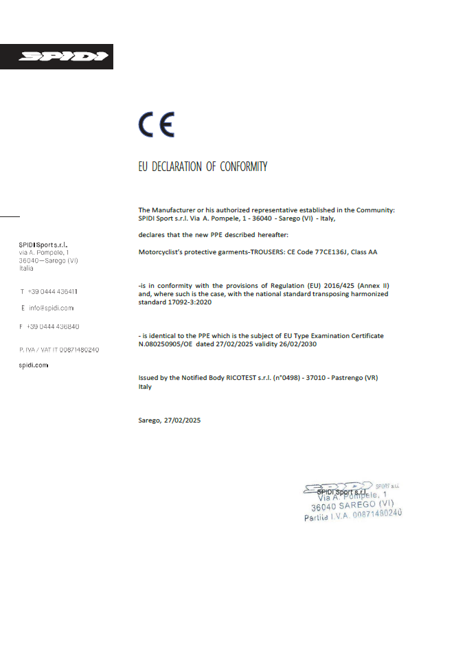 The pants are CE certified to the EN 17092-3:2020 Class AA standard, offering solid protection for road use. A connection zipper and clip stop system allow secure attachment to SPIDI jackets, ensuring full-body protection and stability while riding. Reflective details enhance visibility in low-light conditions.