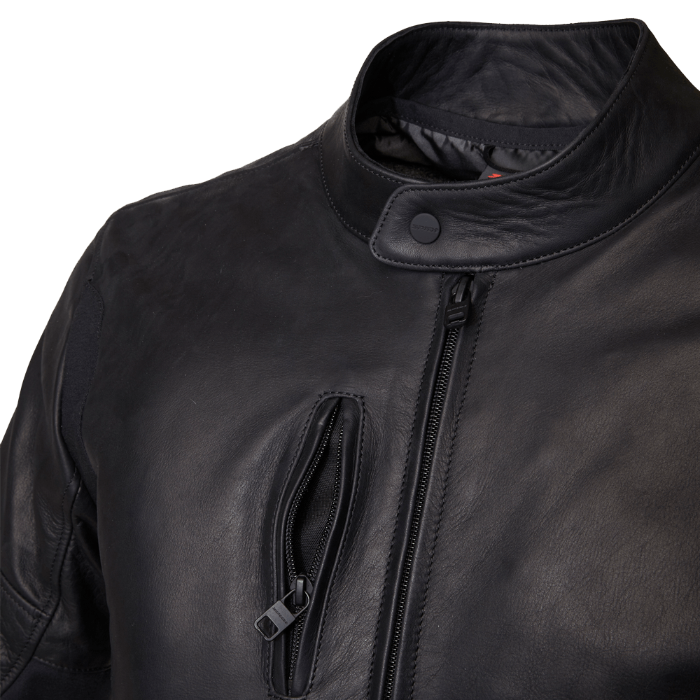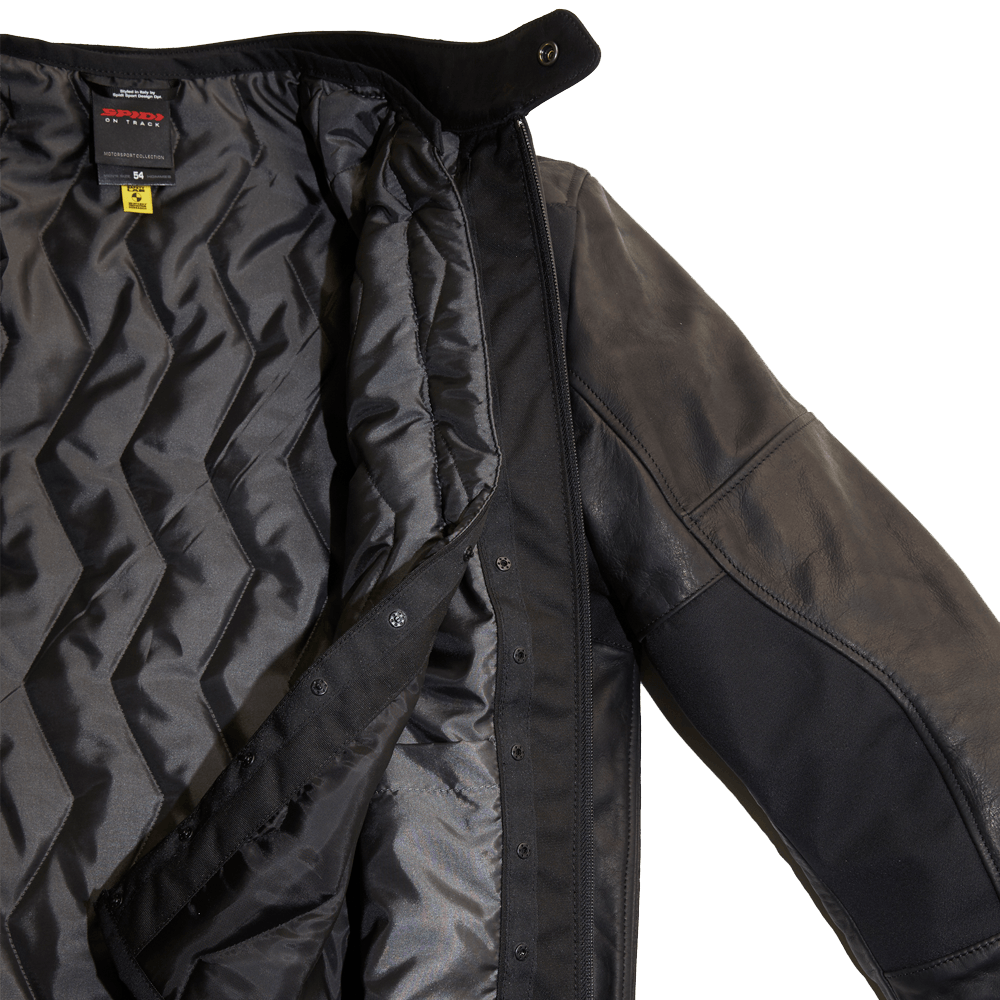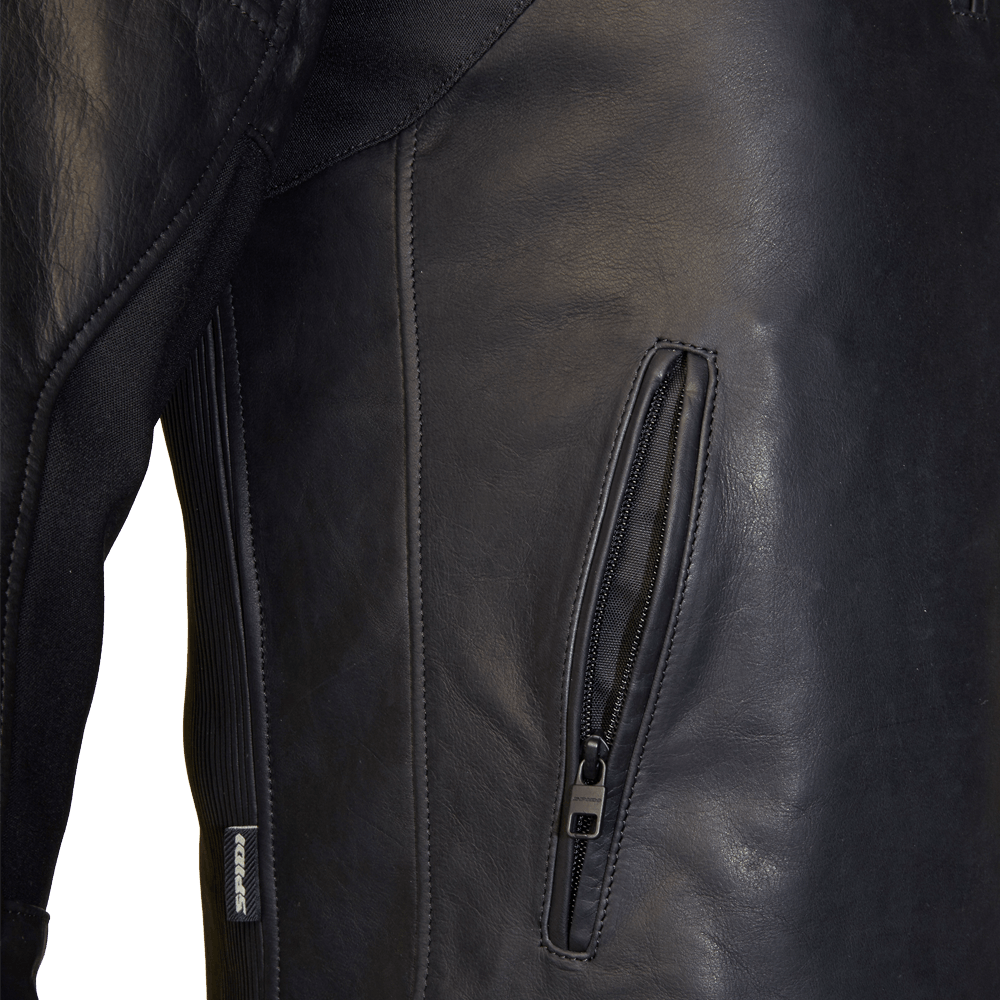 Technische Motorrad-Lederjacke SPIDI mit abnehmbaren EG-zertifizierten Protektoren an Schultern und Ellenbögen.